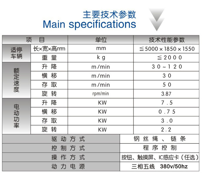 路边堆垛型 使用说明: 1、将车开上升降平台,然后人下车。 2、按操作按扭或刷卡,自动检测车辆是否到位。 3、升降装置开始动作,提升升降平台到指定位置。 4、到位后,纵向存取车装置开始动作,将车移到指定