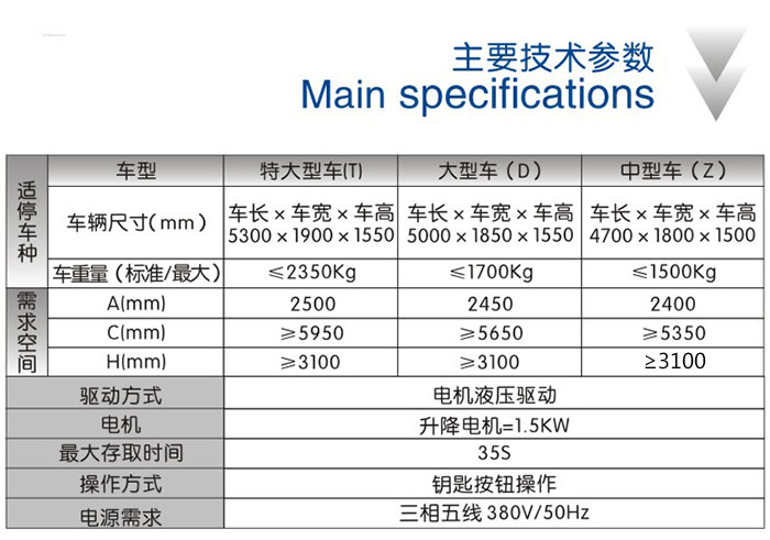 二层简易升降 运行原理 该设备充分利用空间,一个车位能停两辆车。上面层载车板可上下升降;地面层无载车板,地面层车开出后,上方的载车板下降到地面层,完成存取过程。 特点 ●对有限的停车空间,可倍双停放车辆,